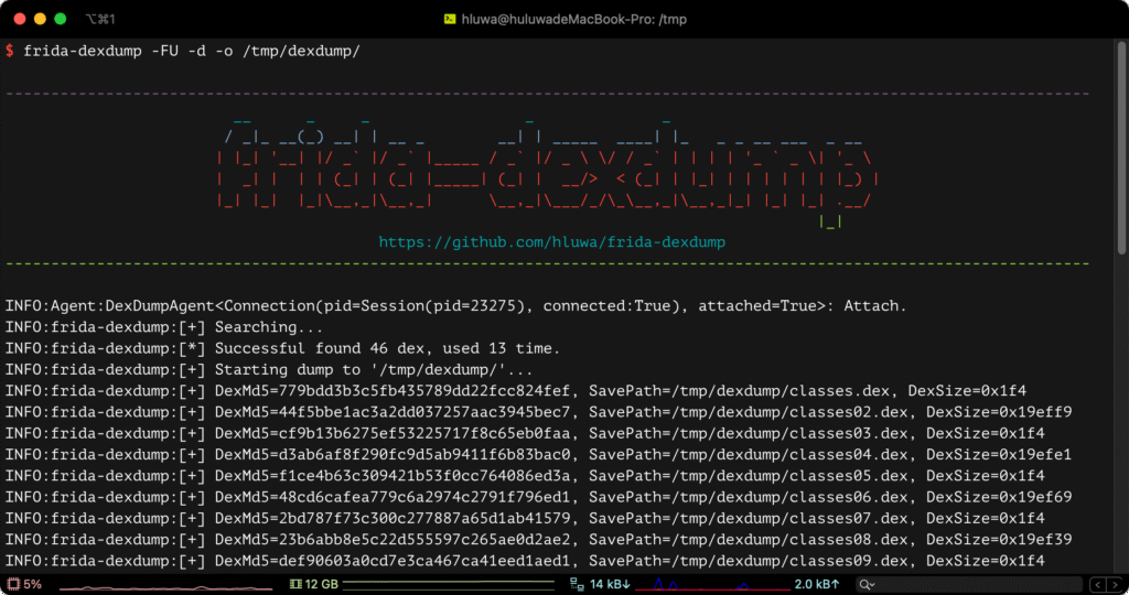 frida-dexdump is a frida tool to find and dump dex in memory to support security engineers in analyzing malware.