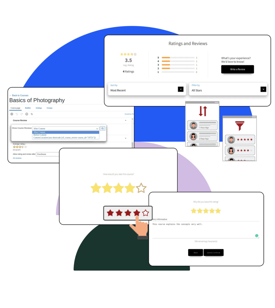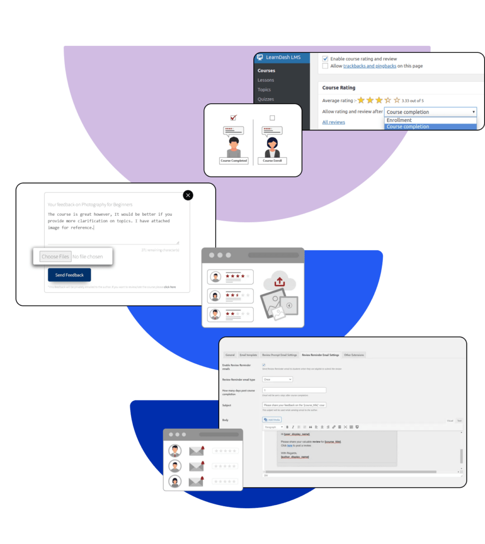 Have full control over the display of ratings and reviews, set custom templates and make your courses better with student feedback.
